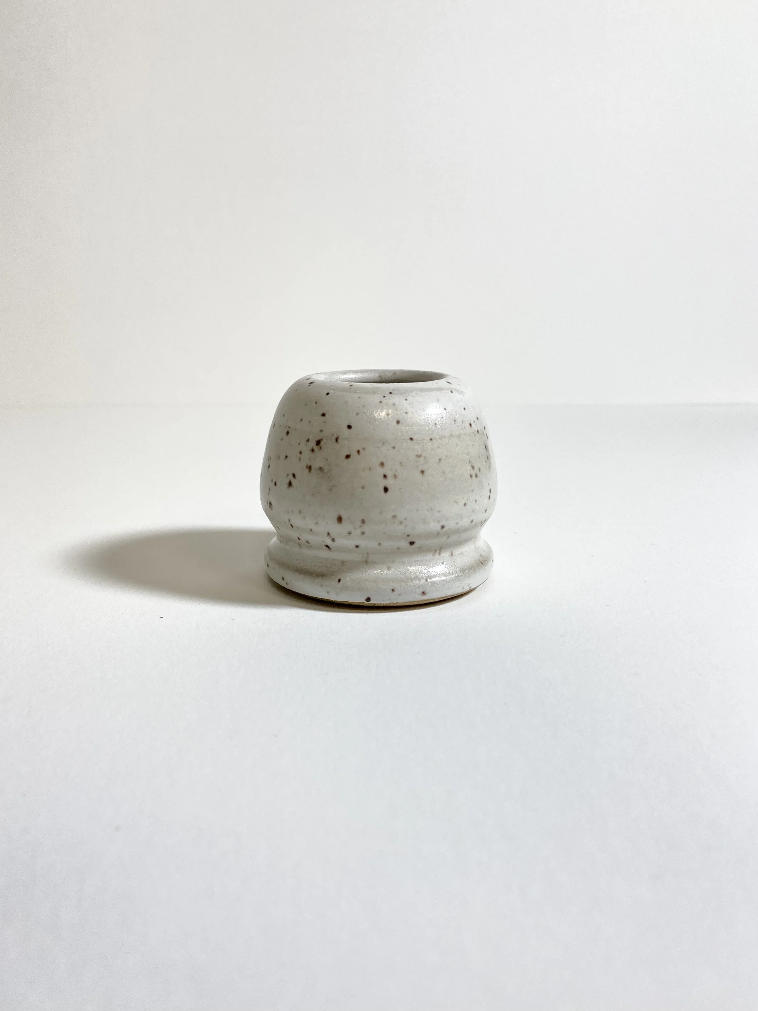 For the serious and not so serious matcha tea drinker. This whisk stand will let your matcha whisk dry, maintaining its shape, while looking good in the process! Beautiful white satin matte glaze over speckled clay. (Whisk not included.)