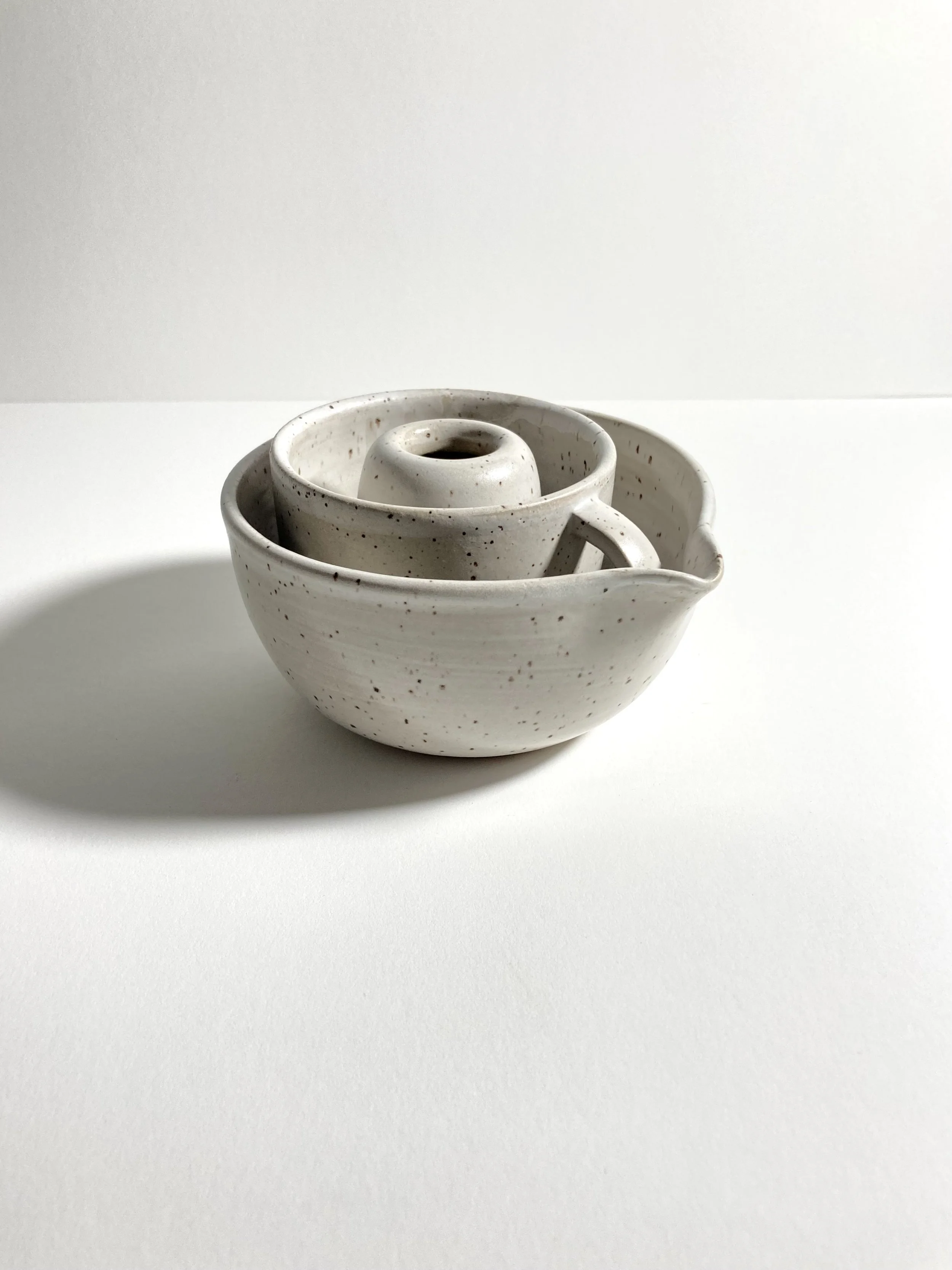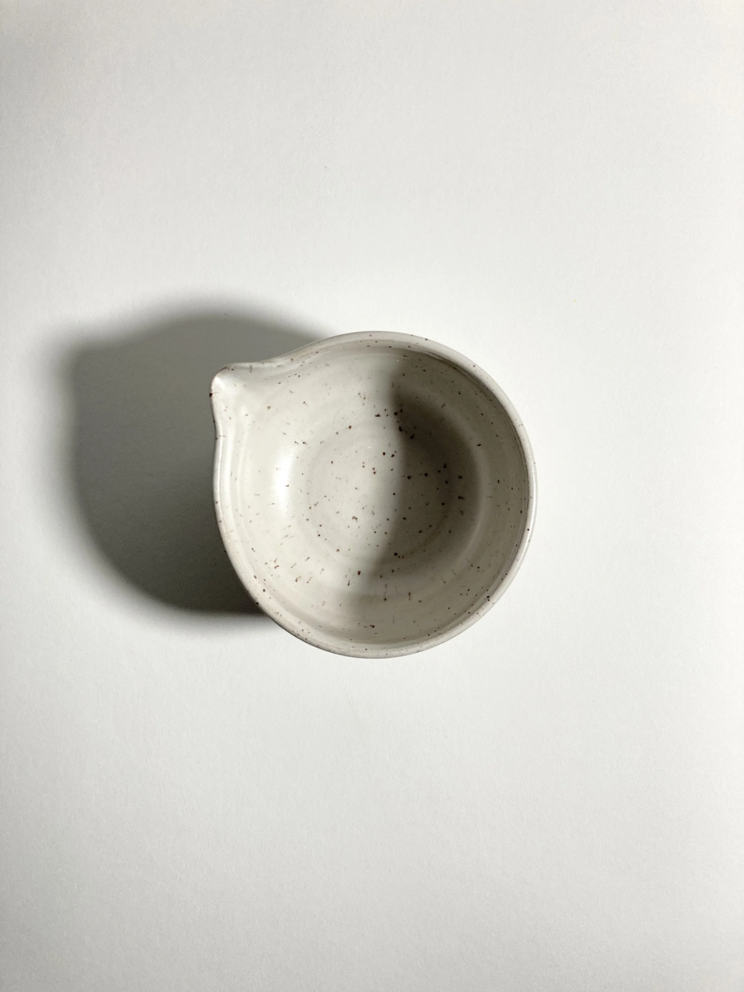 Whisking your matcha in this generously wide bowl allows for better mixing and foam development. The pour spout guides the tea into your favorite cup. Purchase the bowl on its own, or pair it with the matching matcha whisk stand and cup for a beautiful, unique set to keep for yourself or give as a gift. Glazed in satin white over speckled clay. Stand, bowl and cup #2 make a good set together!