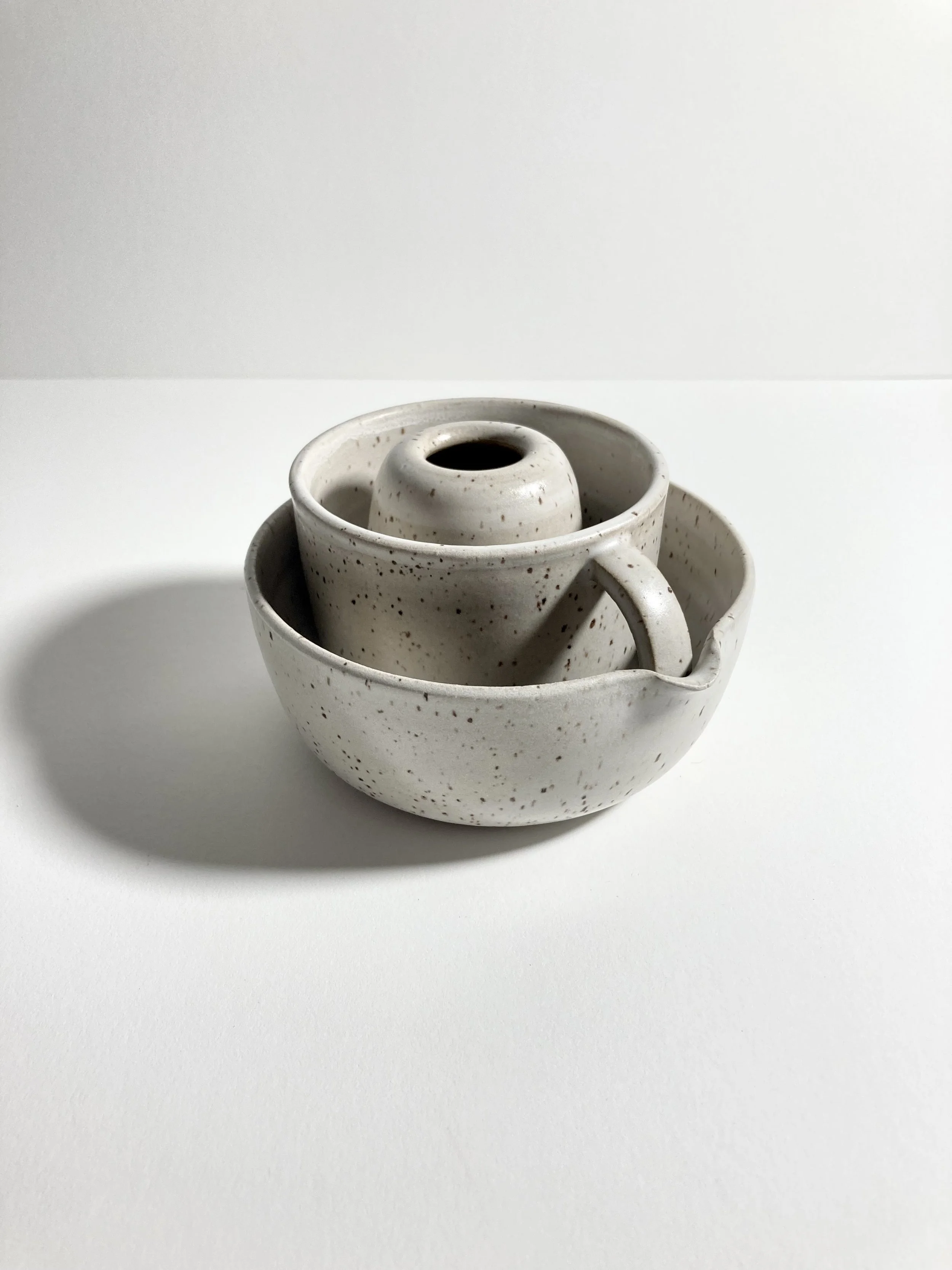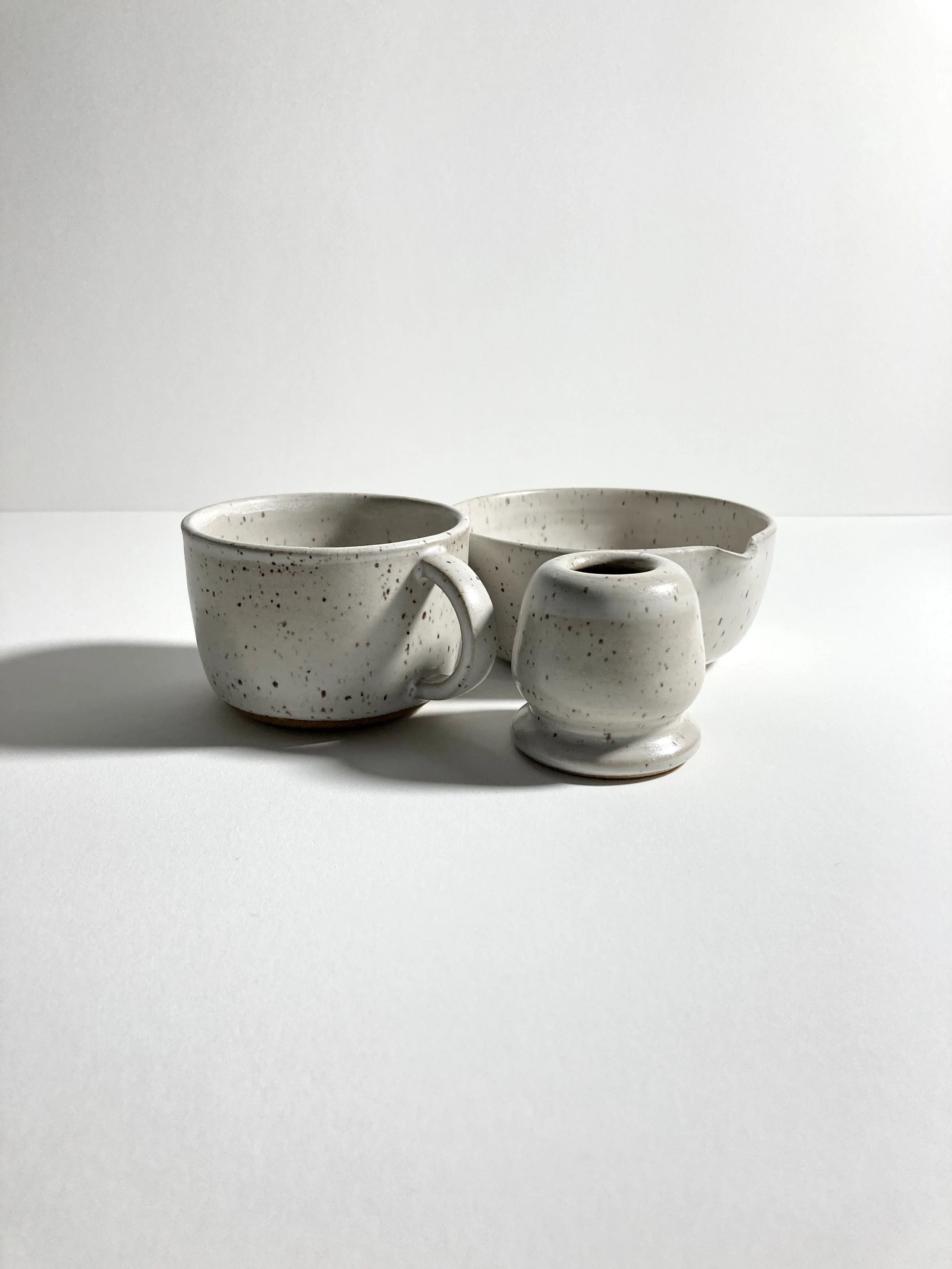Though it can hold more than just matcha, this cup with its satin matte white glaze over speckled clay, was made to partner with the matcha bowl and whisk stand, making a perfectly beautiful set to enjoy or give as a gift. Can be purchased separately or as part of the set. Stand, bowl and cup #3 make a good set together!